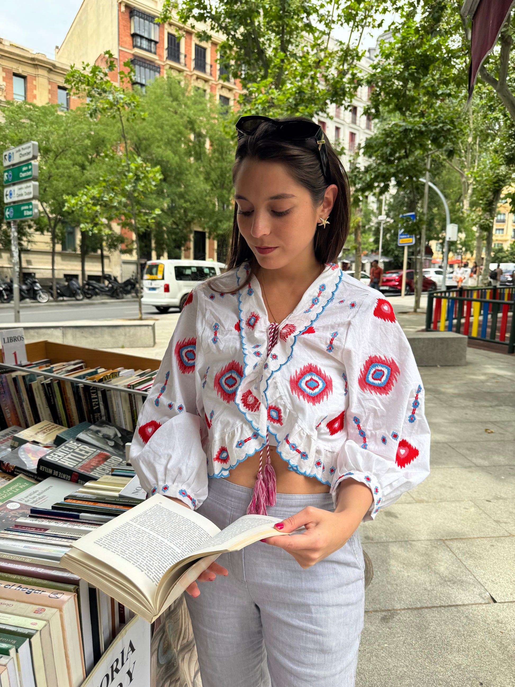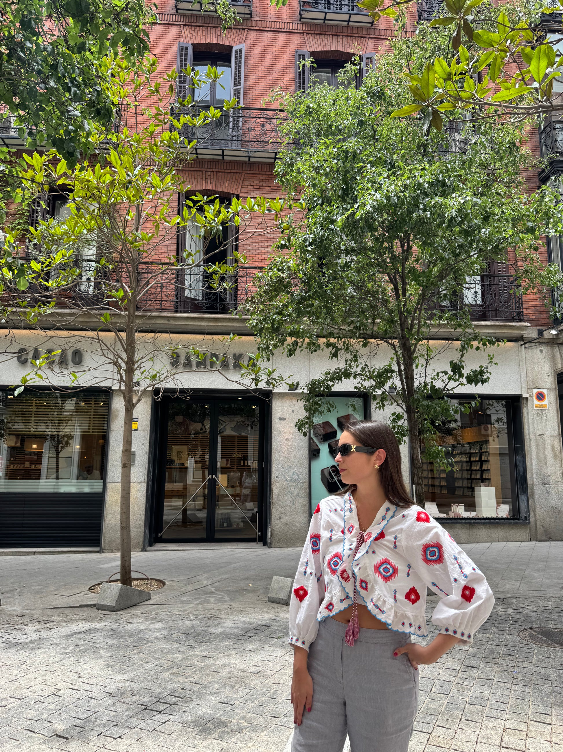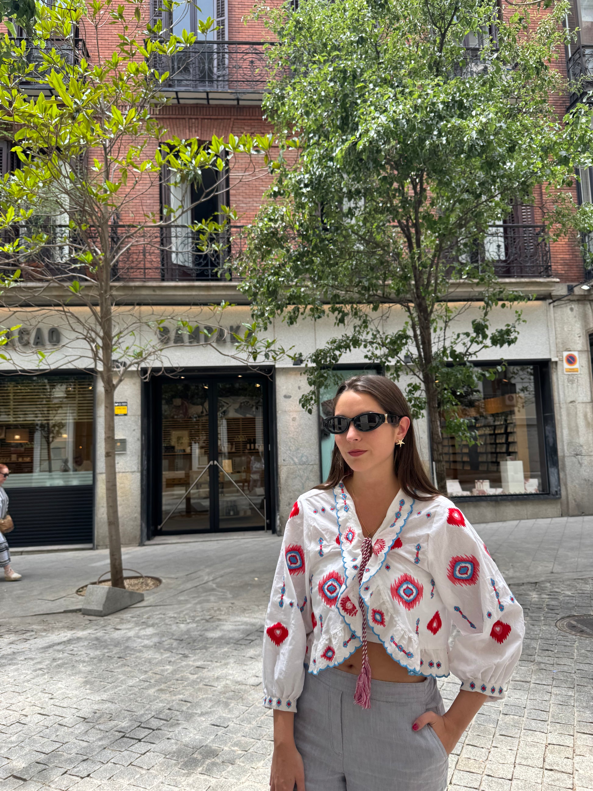 Esta blusa blanca de manga 3/4 combina la frescura del algodón con un diseño artesanal: delicados bordados que aportan textura tiene un pequeño pompón en el centro que añade un guiño divertido y único. Ligera, versátil y fácil de combinar, es perfecta para días soleados o looks relajados con estilo.