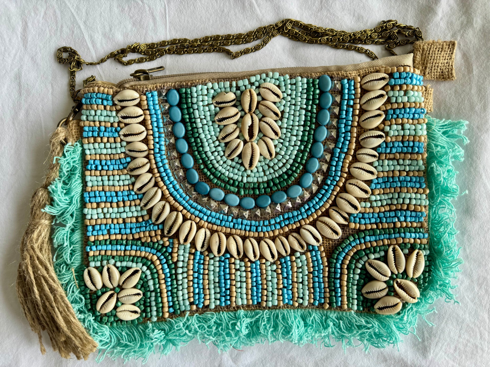 Nuestros clutches son piezas únicas, bordadas con mostacillas y conchitas . Cada uno incluye una cómoda correa para llevarlo al hombro o cruzado, combinando estilo y practicidad.